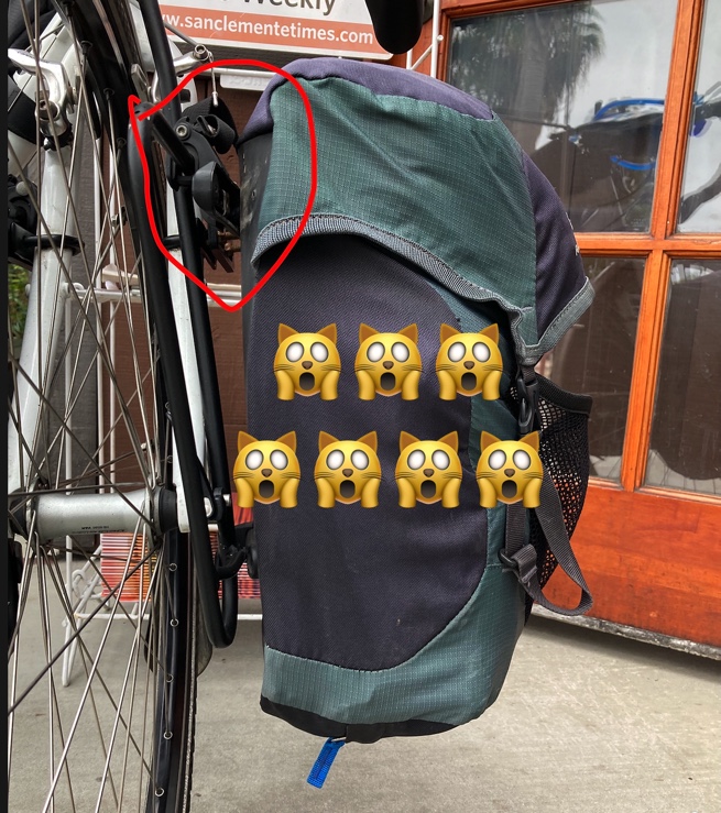I spend a bit more time chatting with Ryan/Farmer Leo and Nathan before that moment of Well, here we go again…I do hope we stay in touch. I speed down the hill to Coast Highway and I’m off. I’m familiar with the route again today, having just ridden a through Laguna, Dana Point, Capistrano State Beach, San Clemente, and San Onofre State Beach a year ago during my brief COVID decampment to Laguna. It’s a 2-mile sometimes steep climb through San Clemente. Ugh. I probably should eat something more substantial so I stop at the Bagel Shack on the south end of town. I get ham, cheese and egg on a sesame bagel. Why ham instead of bacon? I dunno. More protein? Pig on a bagel seems odd but lox doesn’t mix with riding a bike for some unknown reason. Plus, lox on a bagel in a fancy OC beach town where no one is wearing a mask seems out of place. I don’t eat lox with bagels anyway, except at family events. Critical to note, I’ve been totally obsessing about my front panniers and I’m giving them a brave examination at the bagel place. They are both, the right-hand side in particular, coming apart where the bag is supposed to be riveted to the backing. I’d noticed it yesterday and have been keeping my eye on it, as the weight continues to worsen the problem. This setup is not going to last for 55 days or however long it’s going to be. I text with Kaibrina and she is going to pick up a couple of bungee cords as a last resort if glue doesn’t work, or if her handy-dandy engineer dad can’t fix it for me. Pray for me. If either pops off between now and getting it fixed, I don’t know what I’ll do. Flip out, for one thing.
