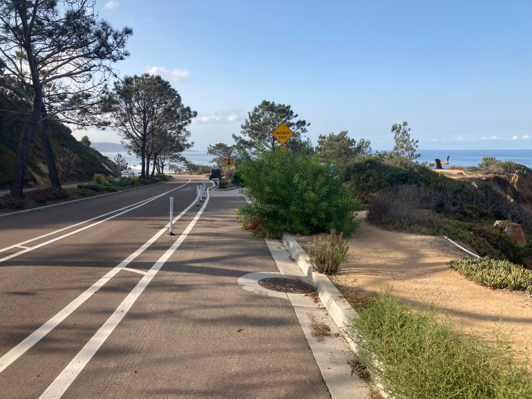I’m off with a big hug from my gorgeous Kaibrina and a 13-going-on-14-year-old-type hug from Kahlil and lots of attention from Carrot whom I’ve given treats in order to get such a good pic of him. The first part of the day is pure joy. It’s cool out, not too sunny, not too windy, or hilly. I ride through some fancy San Diego County seaside townage such as Solana Beach. So fancy. If I had money, this is where I’d want to live. I want to be an old person run-walking along the Pacific. “Still got it!” Or pedaling on my bike and accosting cyclist caballeros with panniers where they’re headed and bend their ears back with my tales. I stop and get an espresso in Del Mar. I don’t know why. Maybe because it’s there? A last hurrah before I’m drinking bad motel coffee or the little sheaths of camping stuff I bought at REI? Then the coastal marvel of Torrey Pines Natural Reserve!