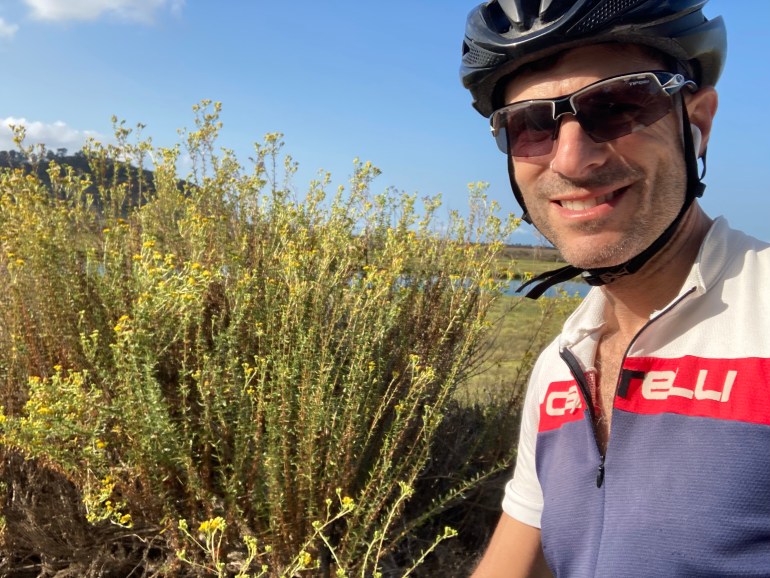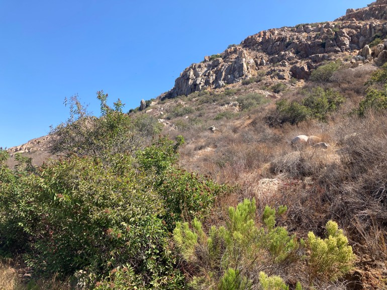 At mile 38, something unexpected and magical happens: there’s big park with a bike path! I don’t have a clue about Mission Trails Regional Park until I enter it. I’m experiencing non-coastal nature for the first time of the trip! Check! The terrain is rocky (not the path) and dry and deserty, a hint of what’s to come. The wind is still favorable. In my airpods Janelle Monae is singing My heart’s on fuego / go get me water. On a day like this it’s hard for me not to worry a bit about the inevitable comedown. That other shoe. The pendulum will swing the other way and the journey will get difficult. But I’m happy despite being aware of this fact. Hey, you have to be aware of your feelings of joy to acknowledge that they won’t last forever!