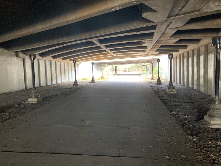 I stop to eat something from the cache on my rear rack in Mission Bay Park and snap pictures. As you can see (and maybe recall), I love taking photos of bridges and tunnels. (Yes, I know these are only tunnels, but there will be bridges, too.)