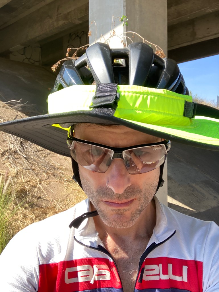 Bladder emptied (color of straw achieved, as per Coach Diego’s demands), I continue on, appreciative of the tailwind that’s still Team HBC. At some point, I realize that it’s time to initiate use of Da Brim Sporty. After a few tries, I think it’s pulled tight enough to my helmet that the wind won’t blow it off. I need some shade. We’ll see if this is all it’s cracked up to be. I do a brief modeling sesh of Da Brim under a bridge, troll that I am. See below.
