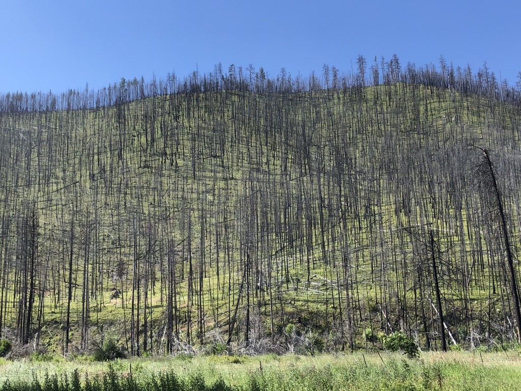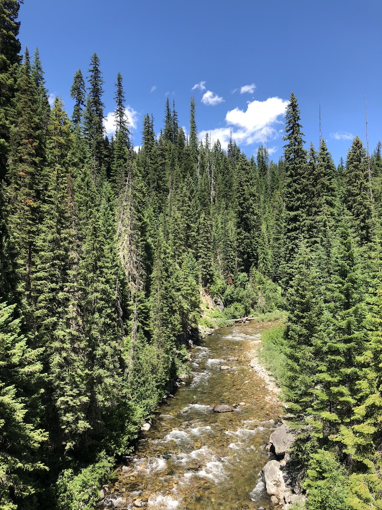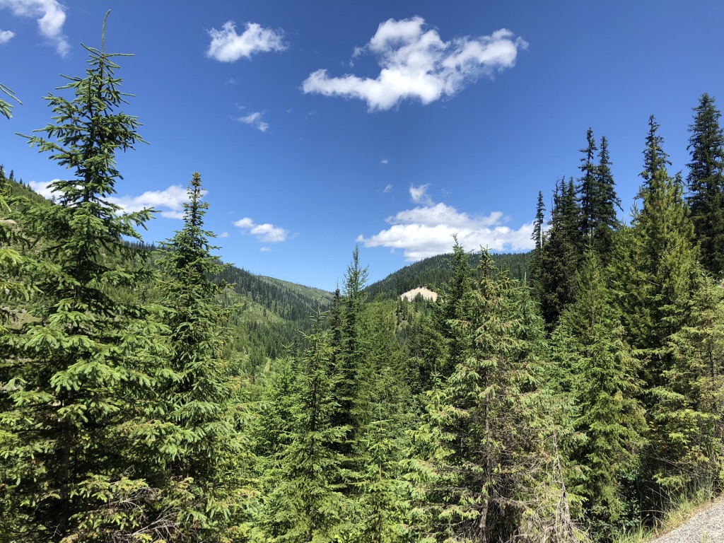 I’m not sure when the screaming started. Blood curdlingly, it rose from deep within my viscera, through every organ, bouncing between each vertebra and rib, reverbing through my sternum and out toward my clavicular joints, roiling my esophagus and intoning my larynx, escaping through my wipe-agape mouth, leaving my uvula flapping and twirling and twisting/untwisting in the breezes and my eardrums boinging and bongoing and my whole body resonating. Perhaps it was only yards below the summit or even a couple of miles. But this next 45 mins—about how long it took to ride down that mountain (including stopping again and again for photos)—is something I’ll never forget. Remember the moment I talked about a few days ago, just a few miles outside of Lincoln, early in the AM, when I felt that unadulterated serenity? I have never forgotten that moment. Same with this experience, just a vastly different color. The vertiginous thrill of the downhill on Route 12’s twists and turns made me feel like Jodie Foster in Contact as she lurches through the wormhole. The spruce, pine and fir of millions of unspoiled Xmas trees, the archetypical blue Big Sky, and paradigmatic white clouds, exhilarated and joyful I screamed at the beauty, with awe and gratitude and some disbelief, I screamed, I bellowed, I hollered, bayed, whooped, screeched, and yawped. I roared. And took photos. I even attempted to video some of it, yes, with my phone and yes riding with one hand and yes at 20mph or more. It was clumsy and scary and I don’t recommend it, for safety reasons but also because the output doesn’t do the experience justice. Video embedded below does not have any screaming unfortunately.