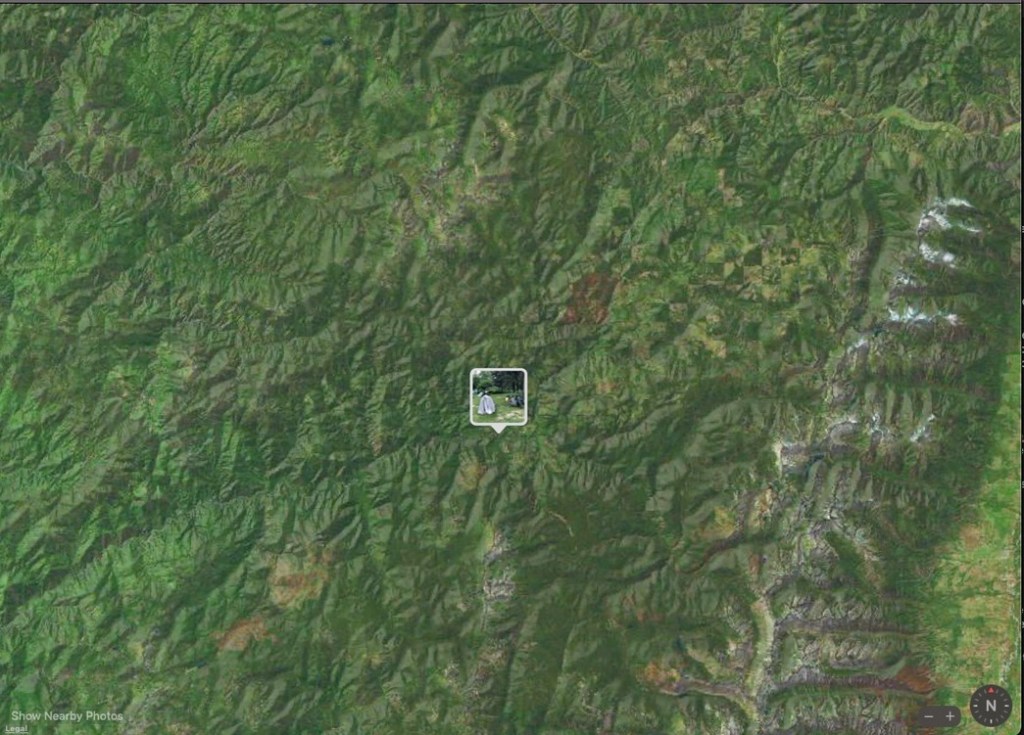 At 55 miles, I make the left turn onto Powell Road and head a few hundred yards into Powell Junction which has a lodge with a restaurant, a one-pump gas station, and a tiny general store behind which cyclists were allowed to camp for free, according to the ACA map. Man, this place is in the middle of a forest. No cell service. Still just the road (as evidenced by the screenshot with photo of my tent).